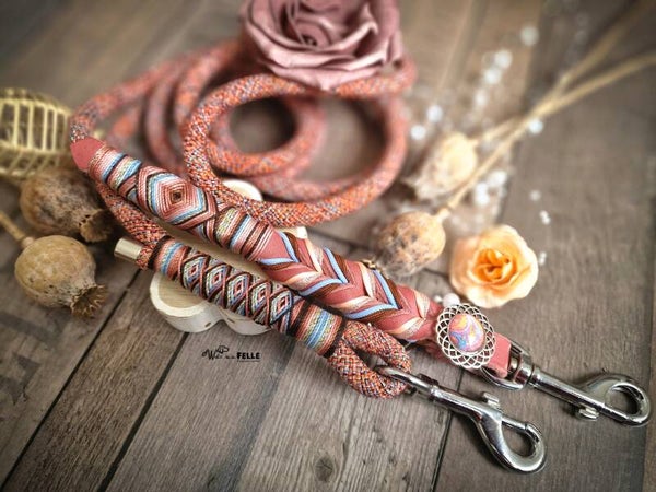 Seil Korallenriff mit Fettleder Altrosa passendem Cord und wutziger Bähmtakelung in Altrosa und Apricot/Lachs (die Farben vom Geschirr halt ), Babyblau, Denim, Rost, Zimt, Metallic Champagner und Dunkelbraun