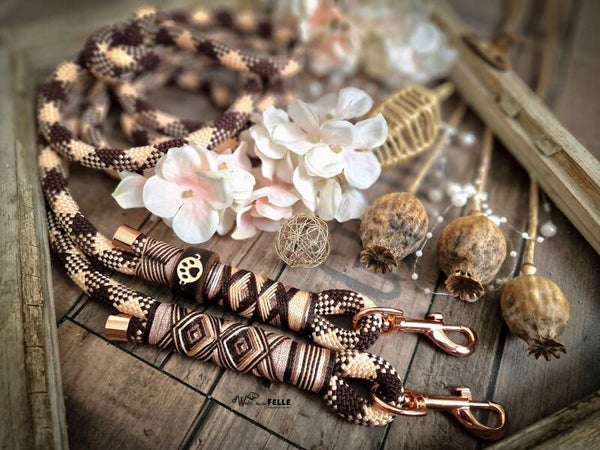 Bei der Leine kann mit oder ohne Fettledereinsatz gewählt werden...in beiden Fällen mit wutziger Bähmtakelung in Espresso, Haselnuss, Apricot und Zartrosa, die Rosé Beschläge passen perfekt zum Seil und machen das Set zu einem echten Hingucker