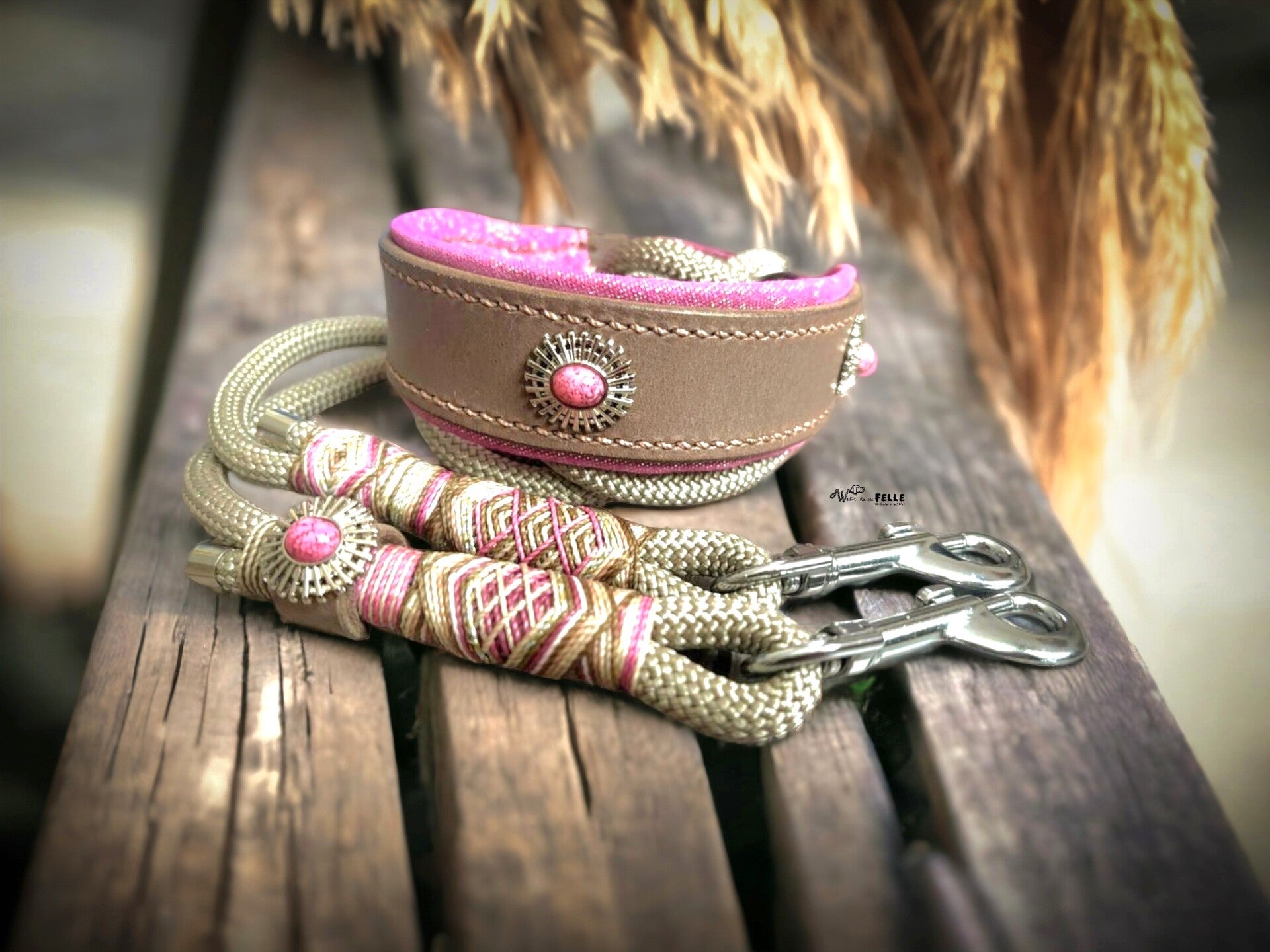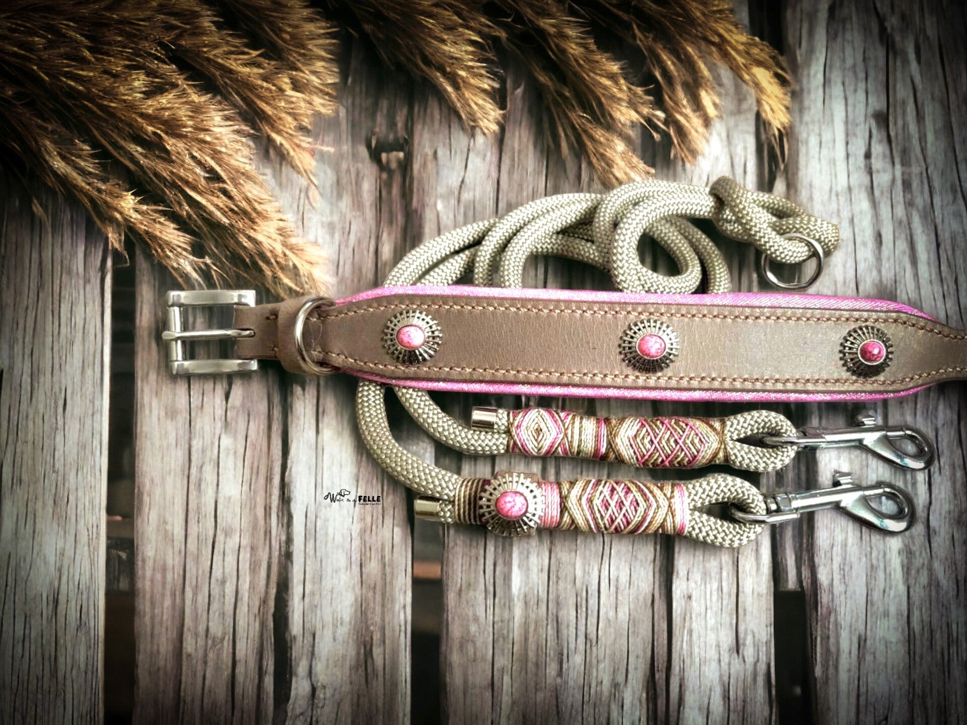 Dazupassende Leine aus unserem Seil "Kornspitz" und Bäääähmtakelung in Taupe, Sand, Schlamm, Champagner, Rosatöne...