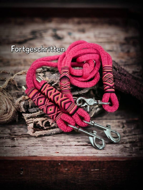 Die Leine besteht aus Seil und Leder, Du lernst dabei diese beiden Materialien mittels Sattlernaht zu verbinden, Leder zu flechten und Paracord miteinzuflechten