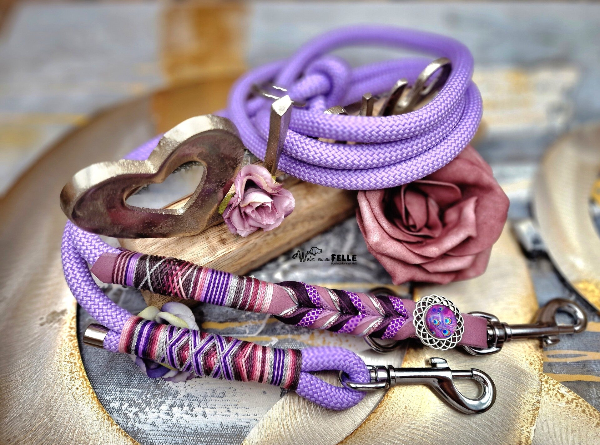 Bei der Leine kann mit oder ohne Fettledereinsatz gewählt werden...in beiden Fällen mit wutziger Bähmtakelung in Flieder, Orchidee, Aubergine und Silber Metallic