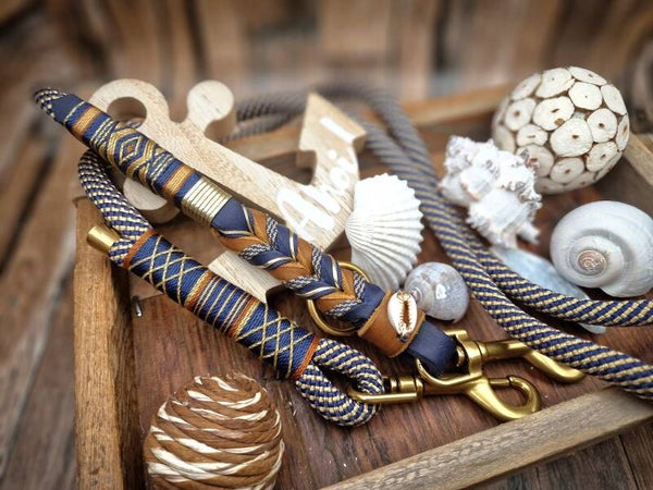 Bei der Leine kann mit oder ohne Fettledereinsatz gewählt werden...in beiden Fällen mit wutziger Bähmtakelung in Marineblau, Gold, Beige.
