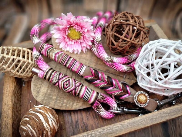 Verstellbares HB und Leine aus unserem Seil Punschkrapferl mit Fettleder Dunkelbraun & Schlamm sowie wutziger Bääääähmtakelung in Dunkelbraun, Taupe, Schlamm, Champagner und verschiedene Rosatöne