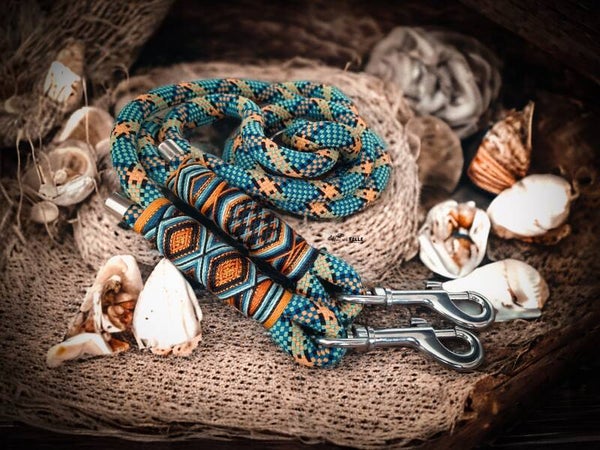 Dazupassende Leine aus unserem Seil "Indiana Joe" und Bäääähmtakelung in Schwarz, Petrol, Türkis, Aqua, Minze, diverse Orangetöne und Metallic Orange.
