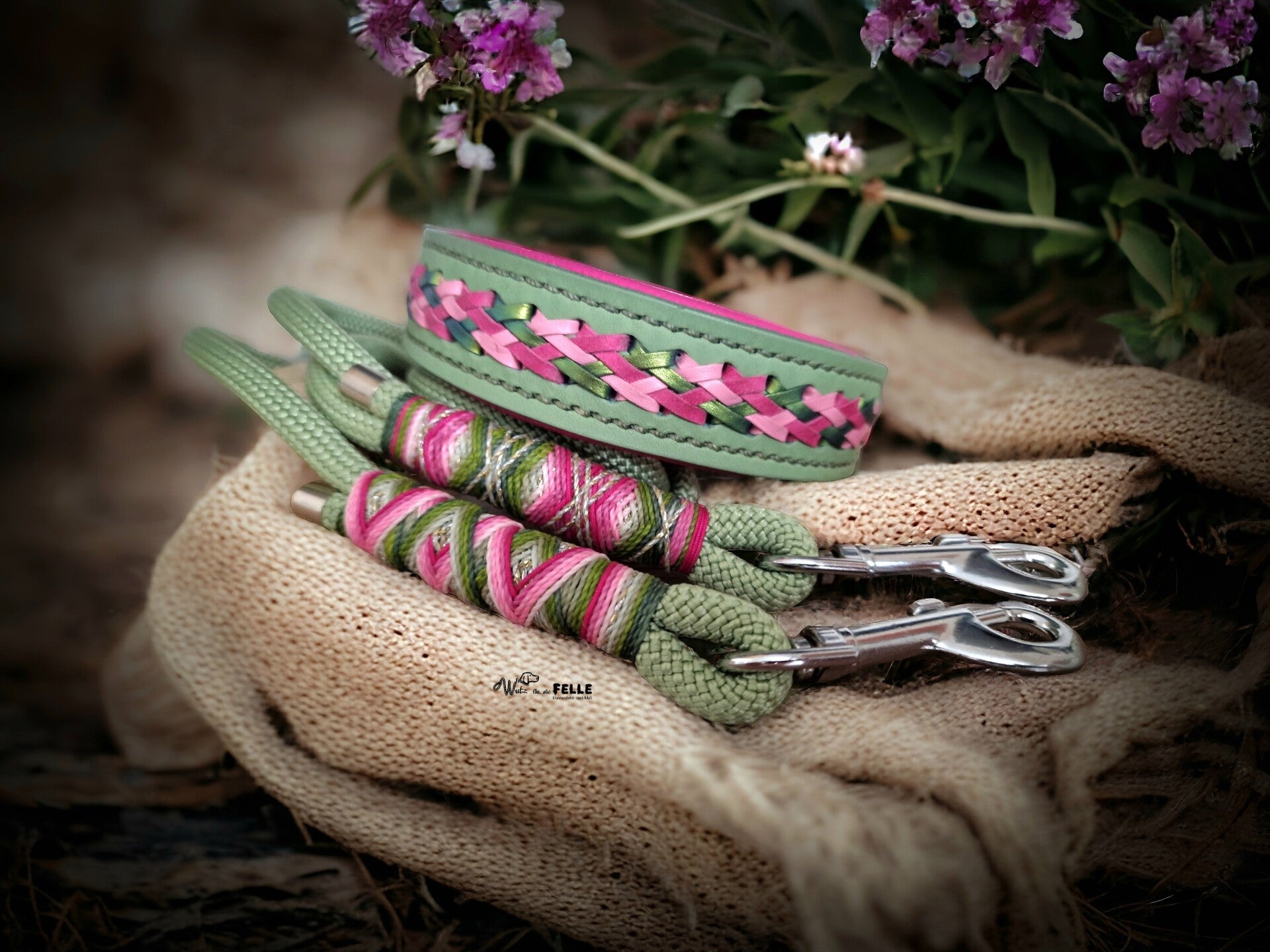 Dazupassende Leine aus unserem Seil "Holy Guacamole" und Bäääähmtakelung in Champagner, 4 Grüntönen und 4 Rosa/Pinktöne im harmonischen Farbverlauf