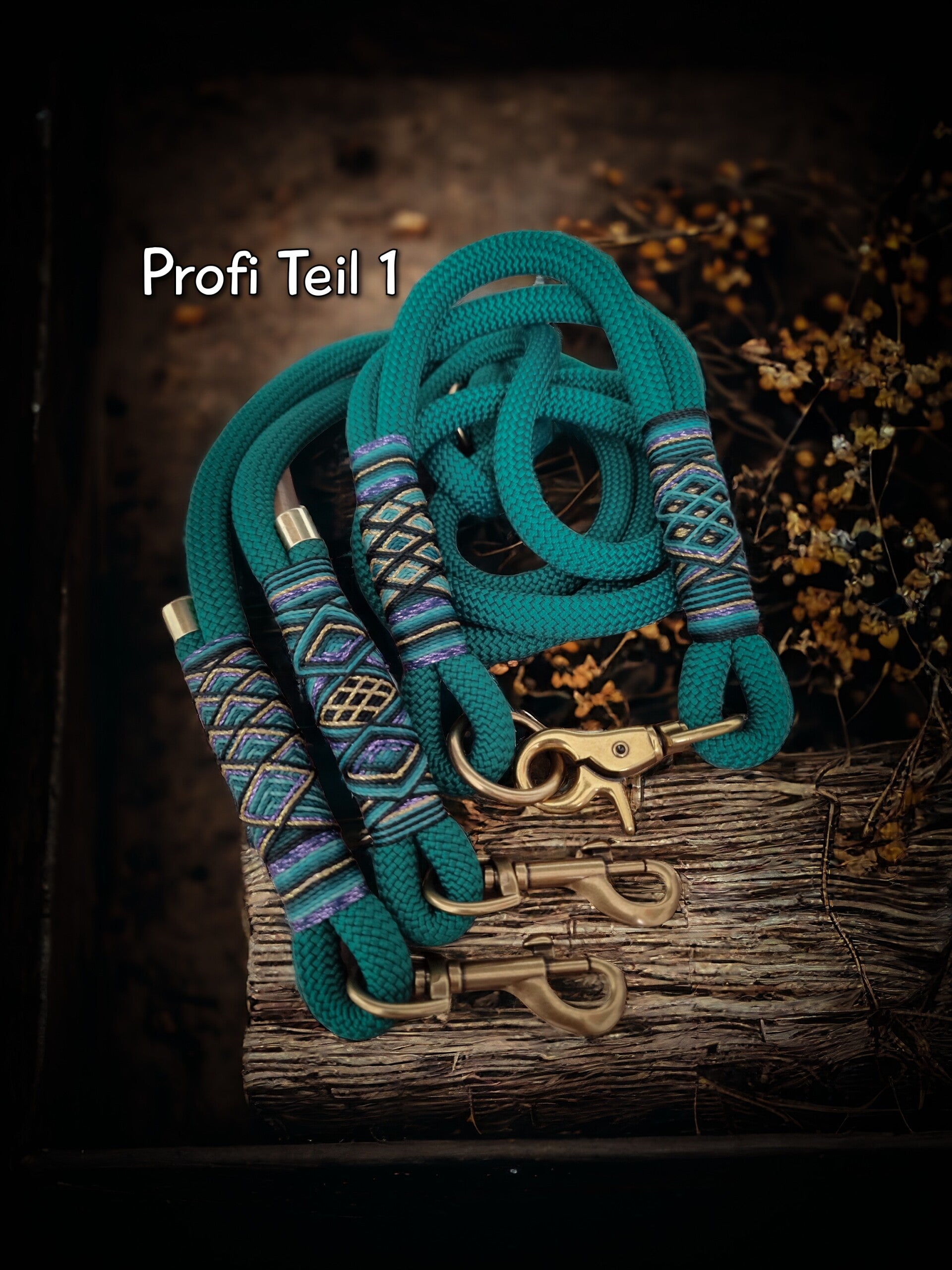 Die Leine besteht aus Seil und Leder, Du lernst dabei diese beiden Materialien mittels Sattlernaht zu verbinden, Leder zu flechten und Paracord miteinzuflechten