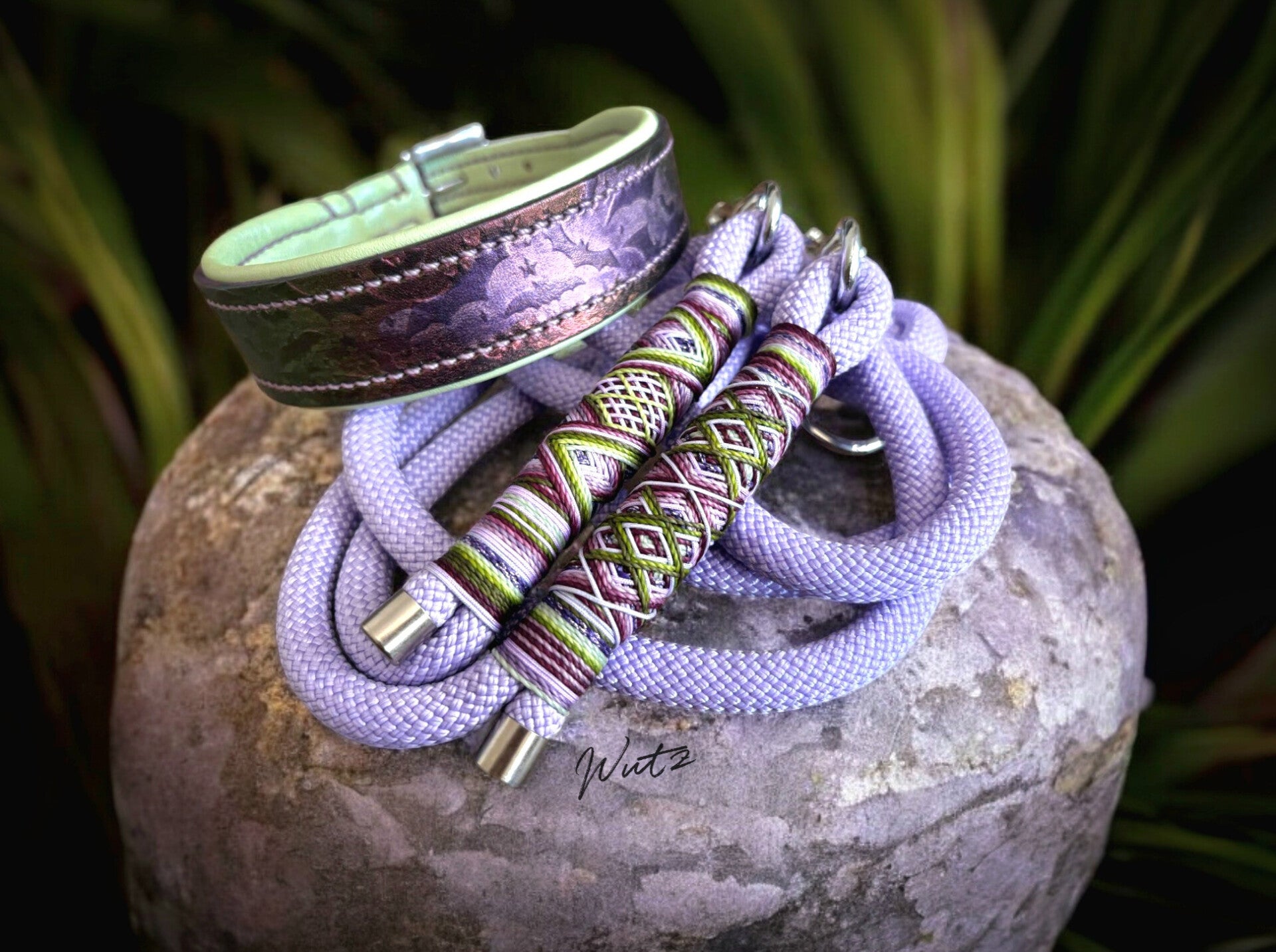 Sofortkauf-Set Leder Handgenäht Fledermaus Hellgrün/Malve/Flieder HU 36-42cm, Leine 2m 2fach