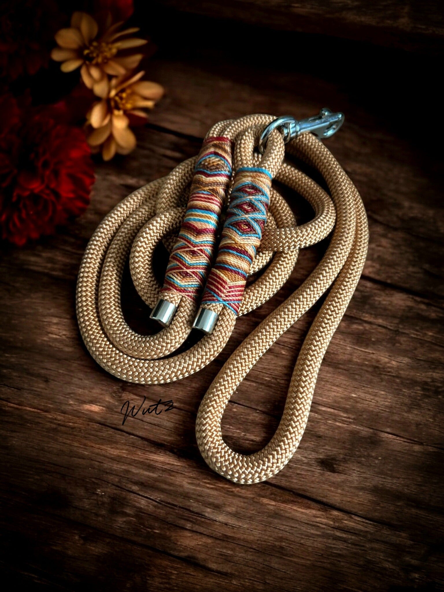 Leine 1,5m mit Handschlaufe mit wutziger Bähmtakelung in Cognac, Zimt, Hellbraun, Rottöne und Türkis.