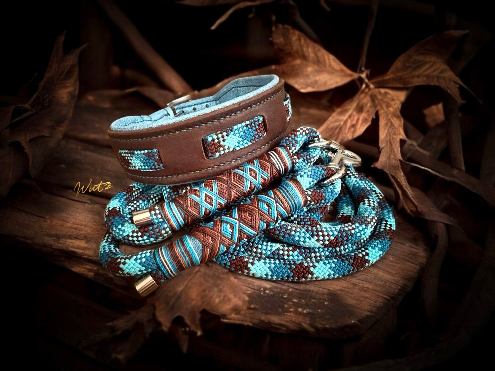Dazupassende Leine aus unserem neuen Seil mit Bäääähmtakelung in verschiedenen Braun- und Türkistönen