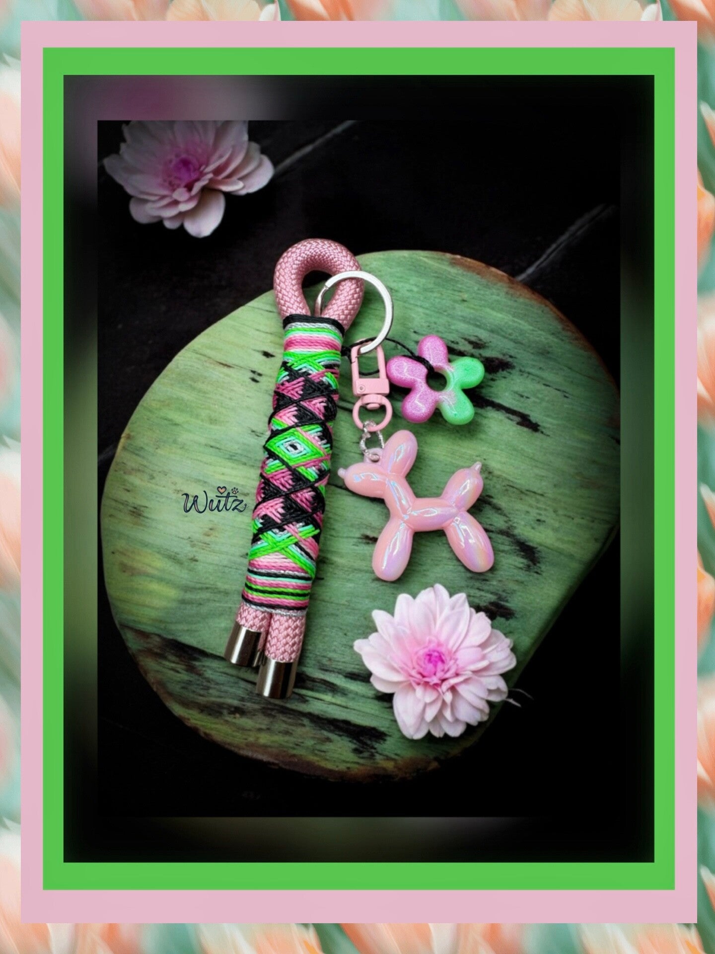 Schlüsselanhänger aus dem Seil Pastellrosa und wutzigem Bäääääähm in Schwarz, Silber, Rostatöne, Frisches Mint und Neongrün