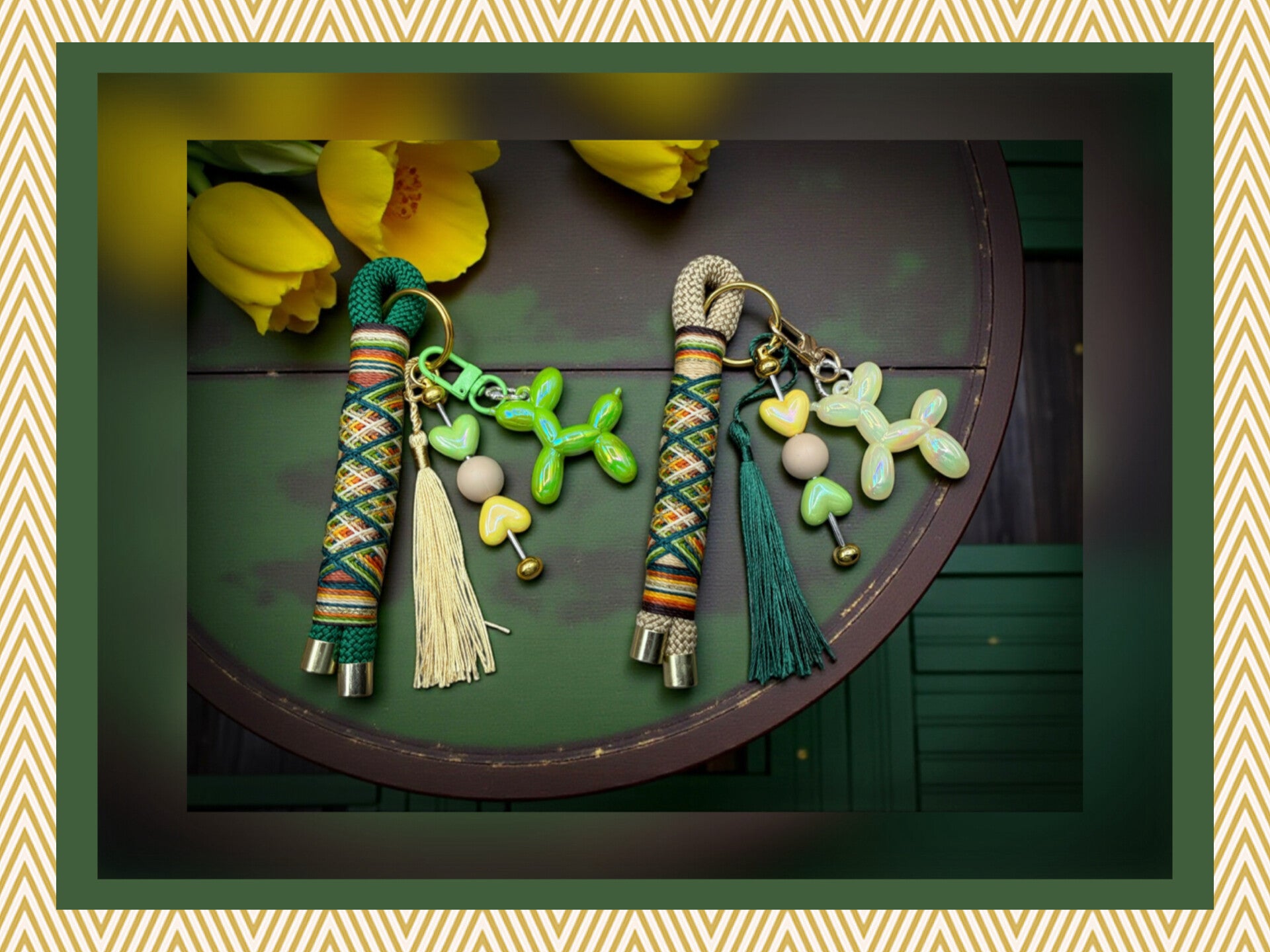 Schlüsselanhänger aus dem grünen oder beigen Seil mit Grüntönen, Orange, Gelb, Gold, Braun, Beige, Creme.