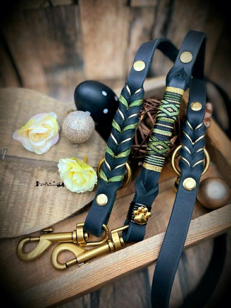 Leine Fettleder Schwarz 15mm und wutziger Bähmtakelung in Schwarz, Olivtönen und Metallic Gold