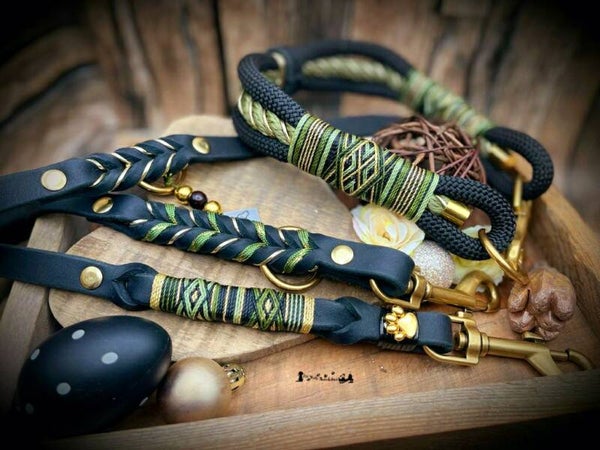 Verstellbares HB dreireihig mit schwarzem Seil außen mit gedrehtem Tau Oliv mittig und Metallic Leder in Gold sowie Leine aus Fettleder Schwarz mit wutziger Bähmtakelung in Schwarz, Olivtöne und Gold