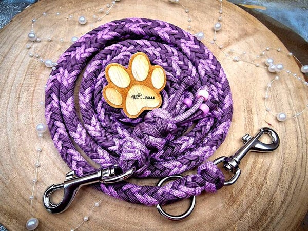 Verstellbares HB aus unserem neuen Seil Malve und mittig handgeflochtenes Glitzercord mit Fettleder Aubergine, Leine aus dem neuen Cord Malve und Glitzercord Orchidee sowie wutziger Bääääähmtakelung in Aubergine, Malve, Orchidee, Rosa, Schwarz und Silber.