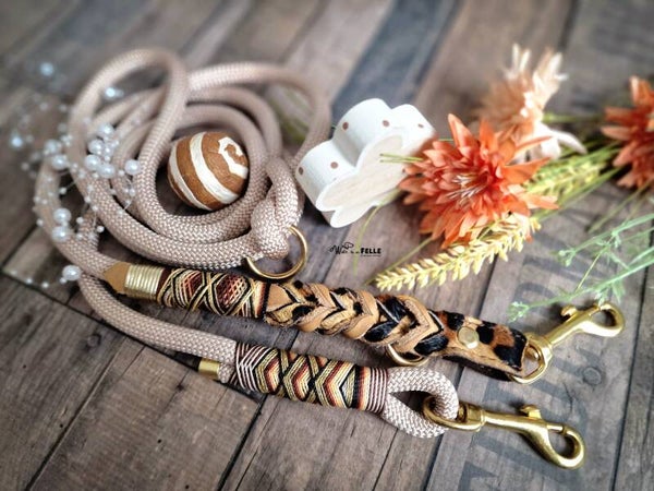Verstellbares HB und Leine aus unserem Seil Caffé Latte mit dem neuen Leo-Look Leder & dem neuen Fettleder Kamel sowie wutziger Bääääähmtakelung in Schwarz, Brauntönen, Kamel, Melone, Lachs, Hellgelb, Creme & Gold Metallic